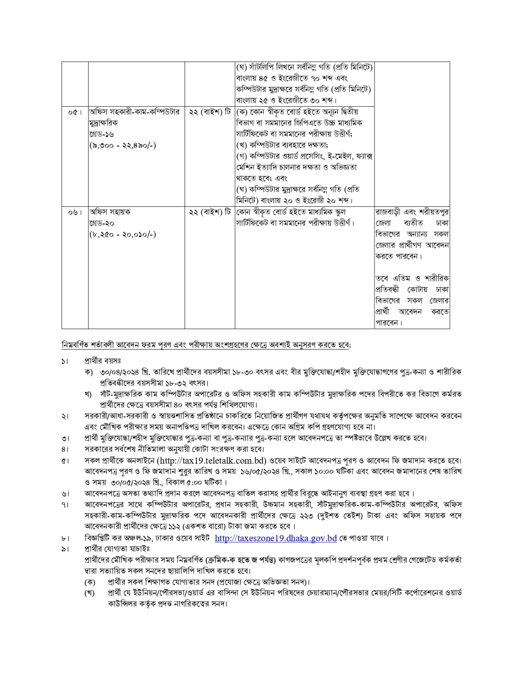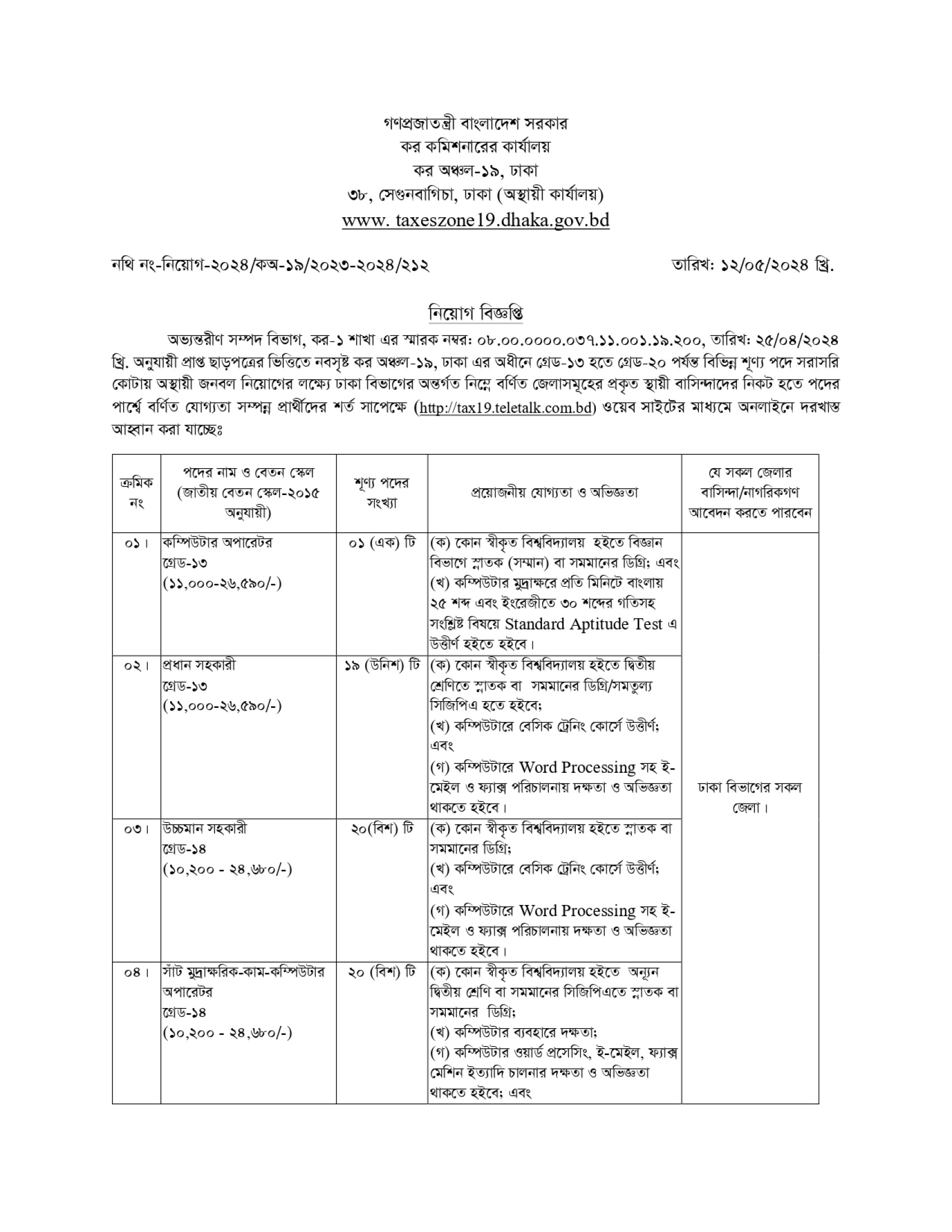 কর কমিশনারের কার্যালয়, ঢাকা কর অঞ্চল-১৯ এর অধীনে ০৬ টি পদে মোট ১০৪ জনকে নিয়োগ দেবে। পদগুলোতে নারী ও পুরুষ উভয়েই আবেদন করতে পারবেন। আগ্রহী প্রার্থীরা অনলাইনে আবেদন করতে পারবেন। এই চাকরিতে ঢাকা বিভাগের সকল জেলা প্রার্থীরা আবেদন করতে পারবেন। সম্পূর্ণ বিজ্ঞপ্তি বিস্তারিত দেওয়া হল।