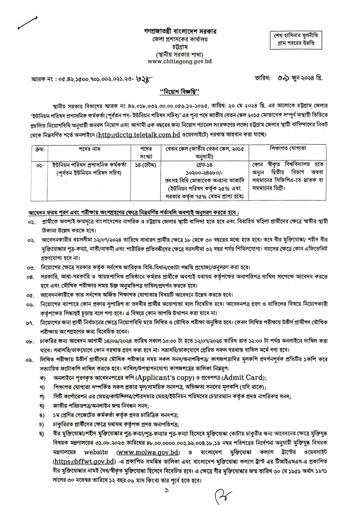 জেলা প্রশাসকের কার্যালয়, চট্টগ্রাম এর অধীনে ০১ টি পদে মোট ১৪ জনকে নিয়োগ দেবে। পদগুলোতে নারী ও পুরুষ উভয়েই আবেদন করতে পারবেন। আগ্রহী প্রার্থীরা অনলাইনে আবেদন করতে পারবেন। এই চাকরিতে শুধুমাত্র চট্রগ্রাম জেলার প্রার্থীরা আবেদন করতে পারবেন । সম্পূর্ণ বিজ্ঞপ্তি বিস্তারিত দেওয়া হল।