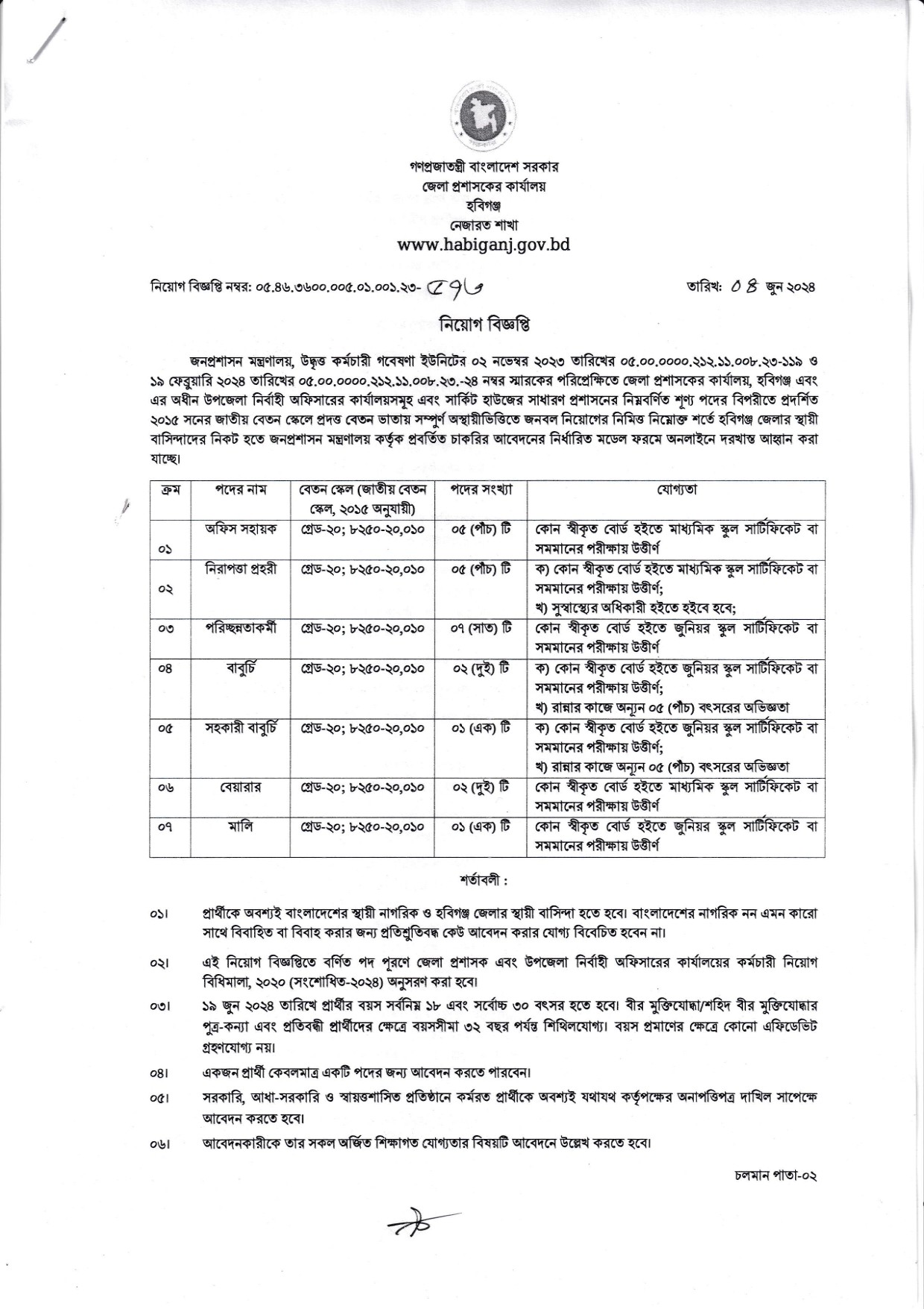 জেলা প্রশাসকের কার্যালয়, হবিগঞ্জ এর অধীনে ০৭ টি পদে মোট ২৩ জনকে নিয়োগ দেবে। পদগুলোতে নারী ও পুরুষ উভয়েই আবেদন করতে পারবেন। আগ্রহী প্রার্থীরা অনলাইনে আবেদন করতে পারবেন। এই চাকরিতে হবিগঞ্জ জেলার প্রার্থীরা আবেদন করতে পারবেন । সম্পূর্ণ বিজ্ঞপ্তি বিস্তারিত দেওয়া হল।