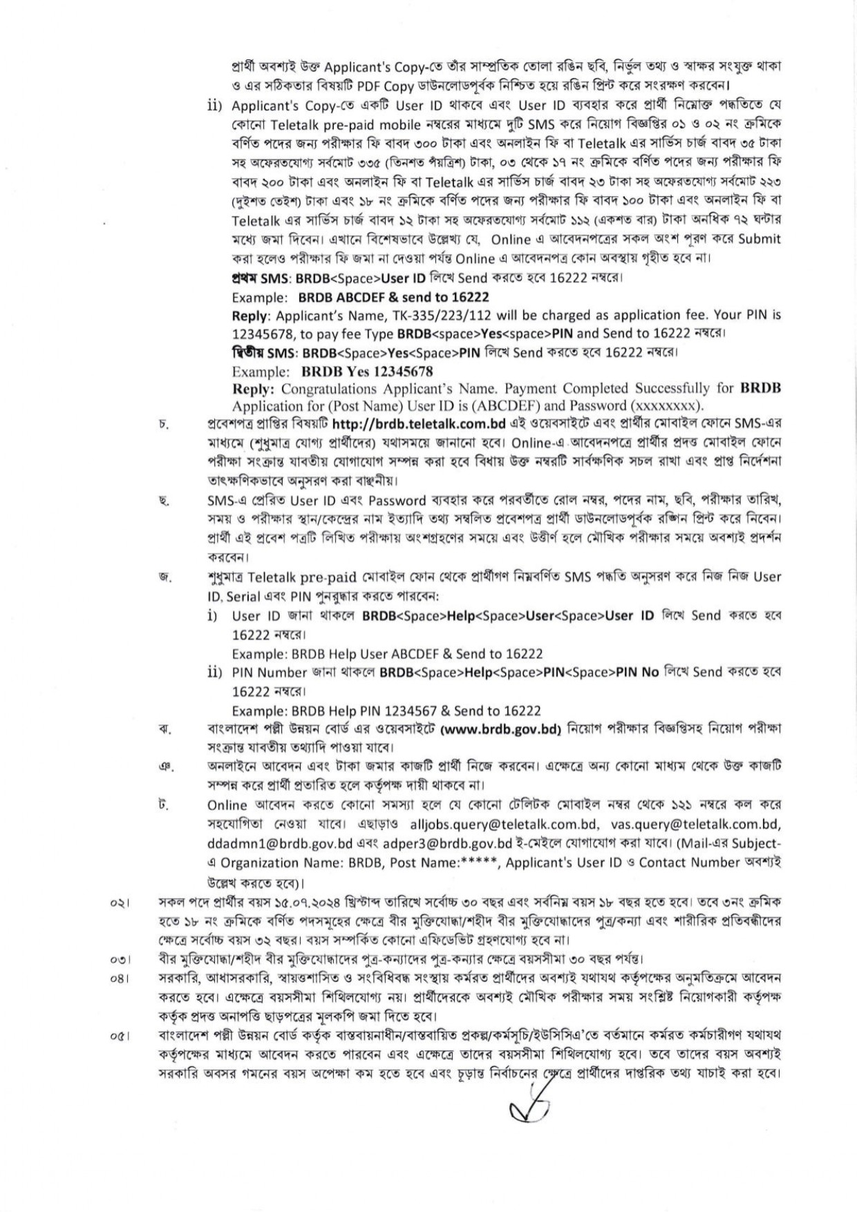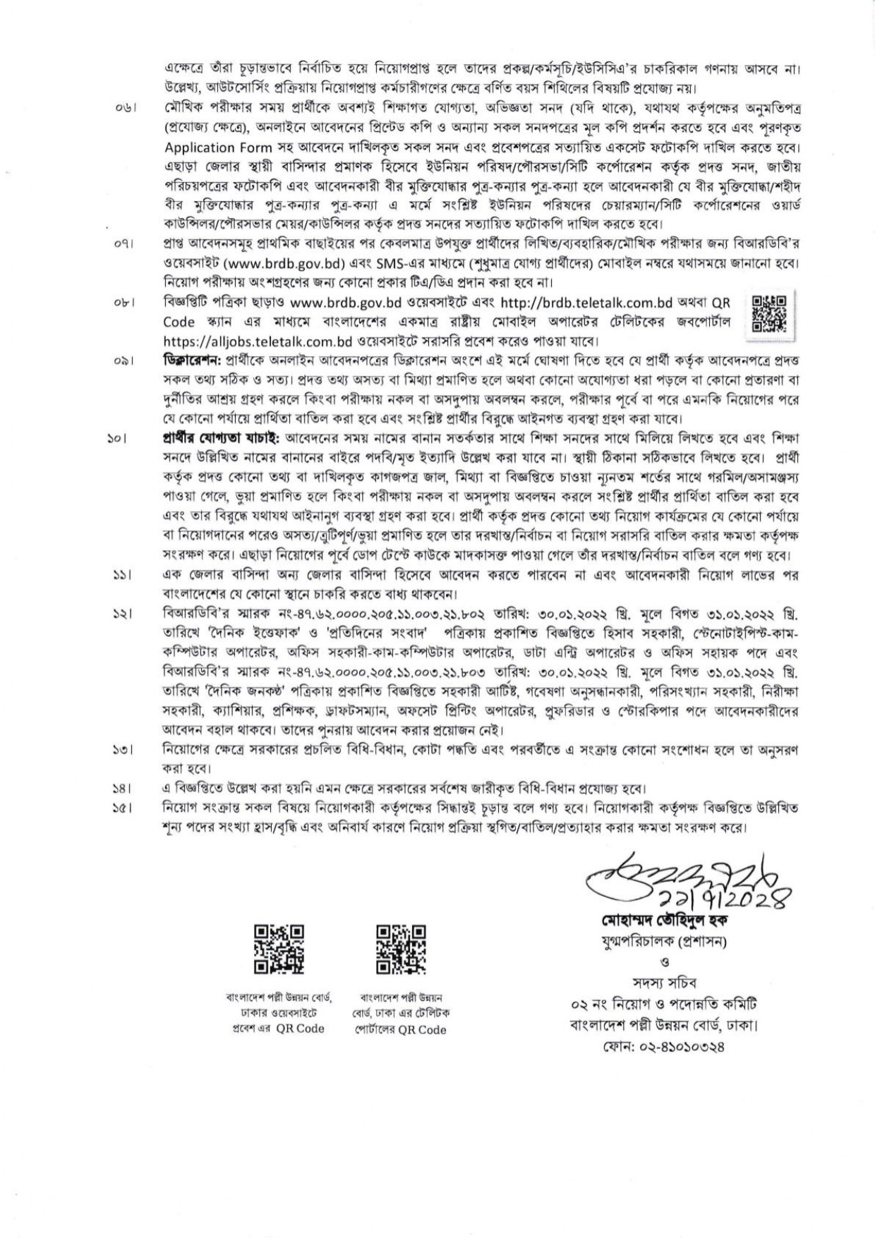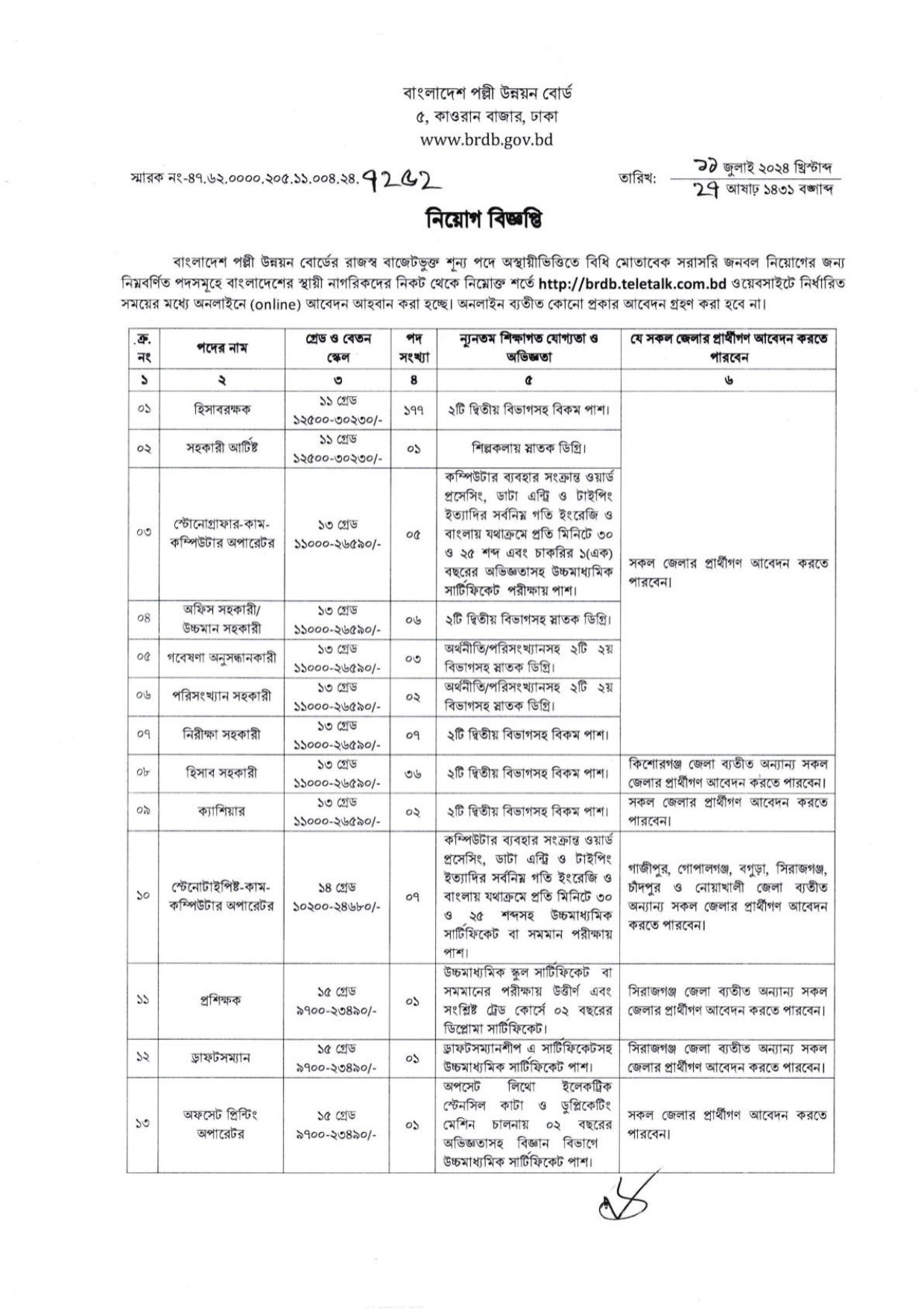 বাংলাদেশ পল্লী উন্নয়ন বোর্ডের রাজস্ব বাজেটভুক্ত শূন্য পদে অস্থায়ীভিত্তিতে বিধি মোতাবেক সরাসরি জনবল নিয়োগের জন্য নিম্নবর্ণিত পদসমূহে বাংলাদেশের স্থায়ী নাগরিকদের নিকট থেকে নিম্নোক্ত শর্তে http://brdb.teletalk.com.bd ওয়েবসাইটে নির্ধারিত সময়ের মধ্যে অনলাইনে (online) আবেদন আহবান করা হচ্ছে। অনলাইন ব্যতীত কোনো প্রকার আবেদন গ্রহণ করা হবে না।