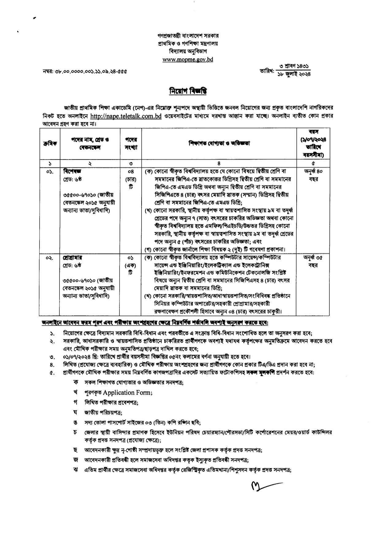আবেদন প্রক্রিয়াঃ আগ্রহী প্রার্থীরা অনলাইনে http://nape.teletalk.com.bd এই ওয়েবসাইটে গিয়ে আবেদন পূরণ করতে পারবেন।