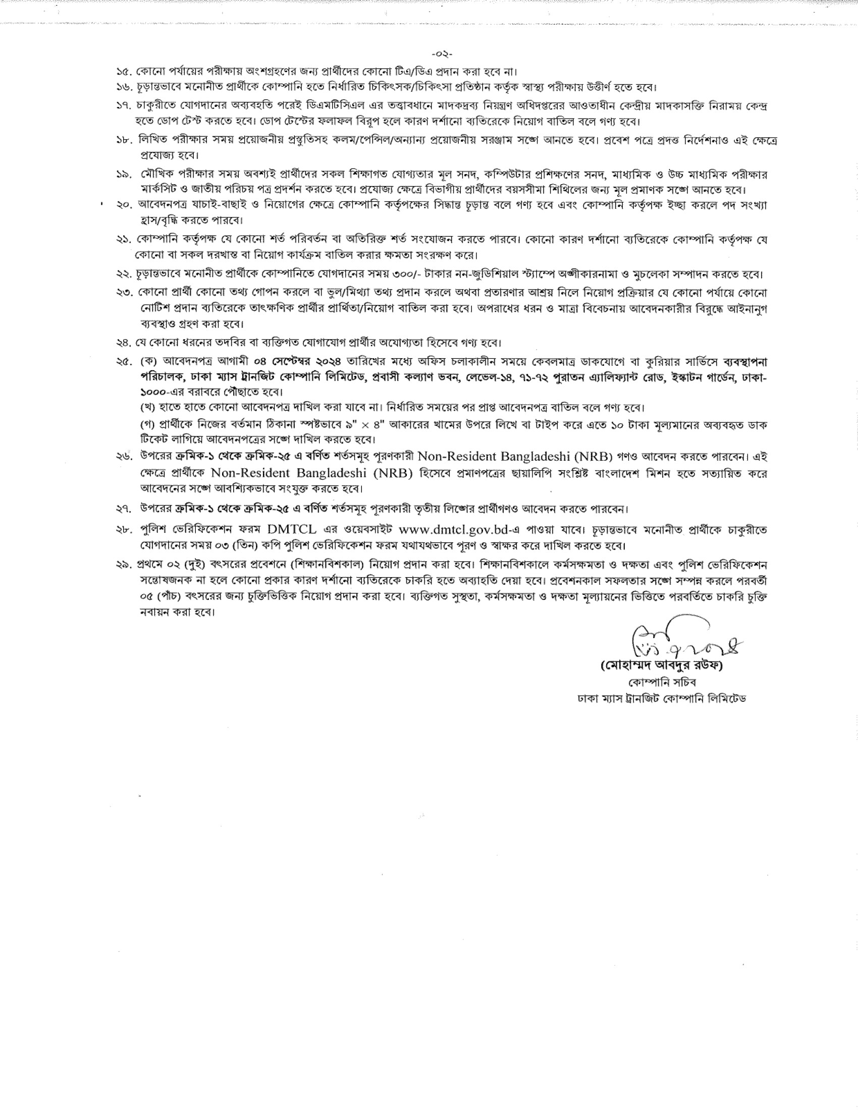 ১. প্রার্থীকে Dhaka Mass Transit Company Limited (DMTCL)-এর নির্ধারিত চাকরির আবেদন ফরমে আবেদন দাখিল করতে হবে।