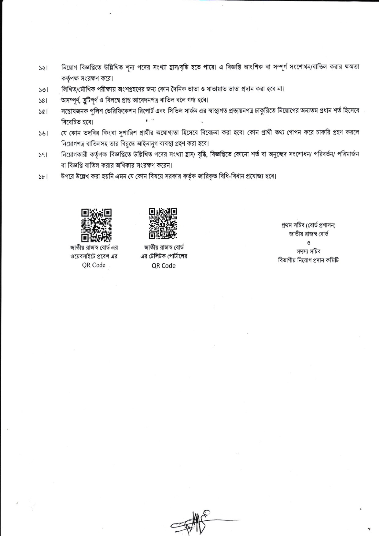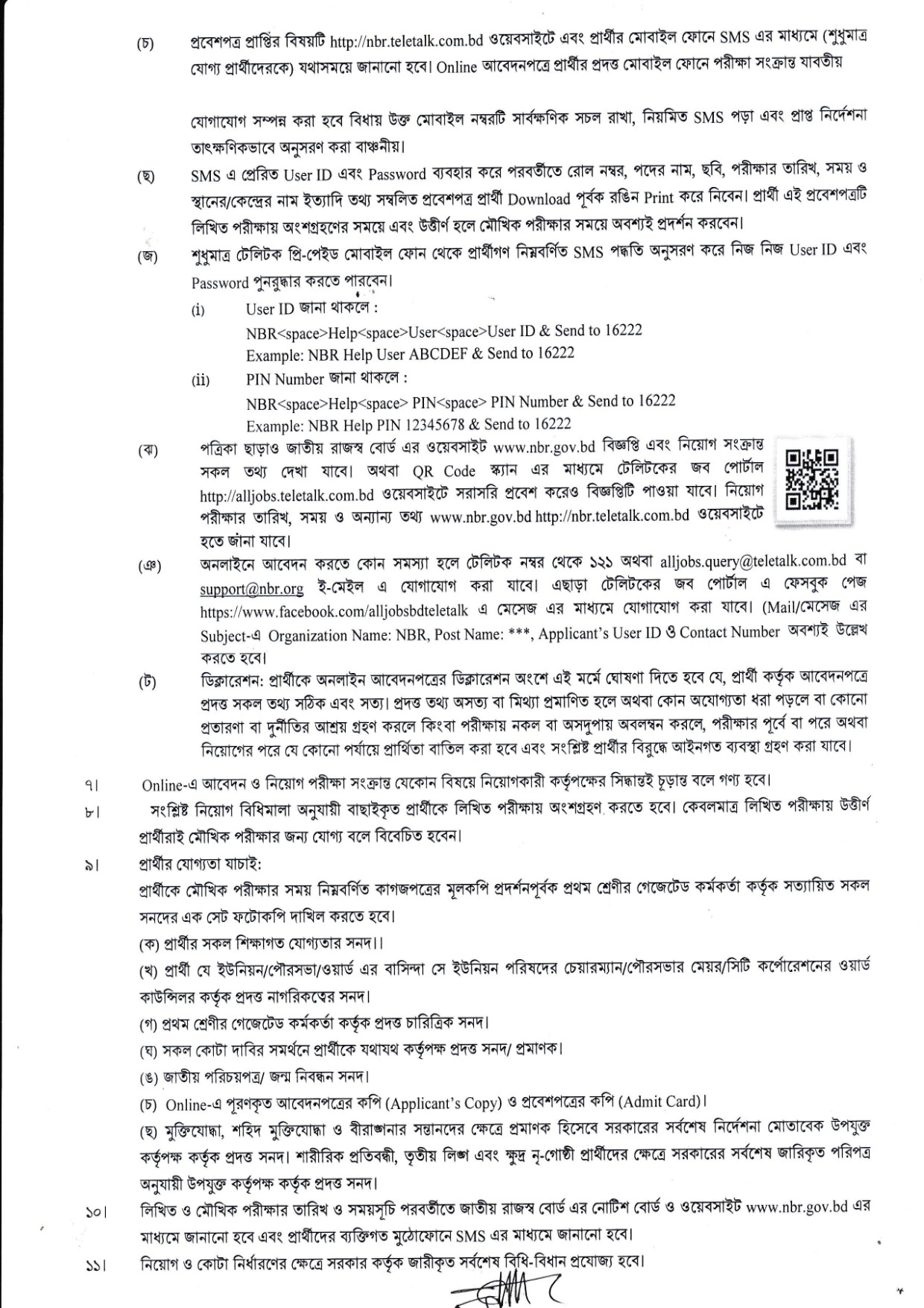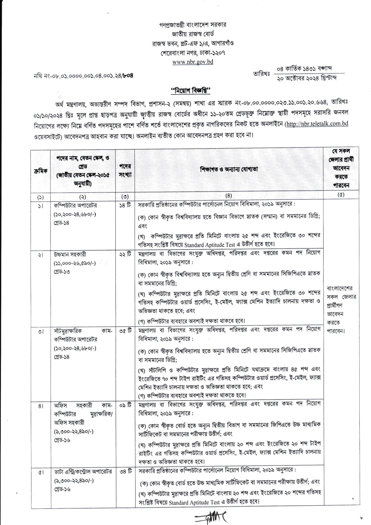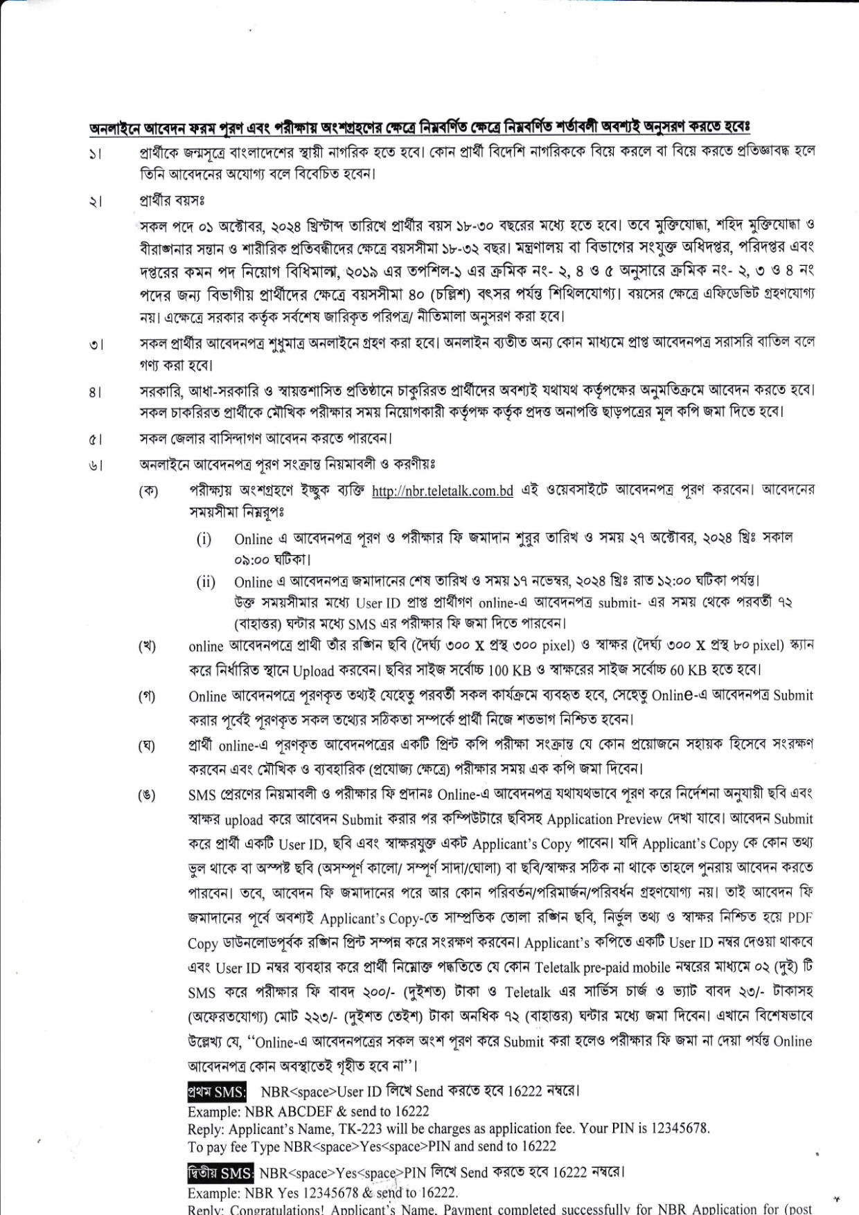 ০১/১০/২০২৪ খ্রিঃ মূলে প্রাপ্ত ছাড়পত্র অনুযায়ী জাতীয় রাজস্ব বোর্ডের অধীনে ১১-২০তম গ্রেডভূক্ত নিম্নোক্ত স্থায়ী পদসমূহে সরাসরি জনবল নিয়োগের লক্ষ্যে নিম্নে বর্ণিত পদসমূহের পাশে বর্ণিত শর্তে বাংলাদেশের প্রকৃত নাগরিকদের নিকট হতে অনলাইনে (http://nbr.teletalk.com.bd ওয়েবসাইটে) আবেদনপত্র আহবান করা যাচ্ছে। অনলাইন ব্যতীত কোন আবেদনপত্র গ্রহণ করা হবে না।
